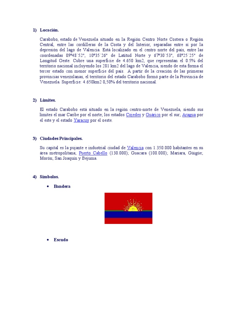 2) Limites. El estado Carabobo est situado en la regin centro-norte de Venezuela, siendo sus lmites el mar Caribe por el norte; los estados Cojedes y Gurico por el sur; Aragua por el este y el estado Yaracuy por el oeste.