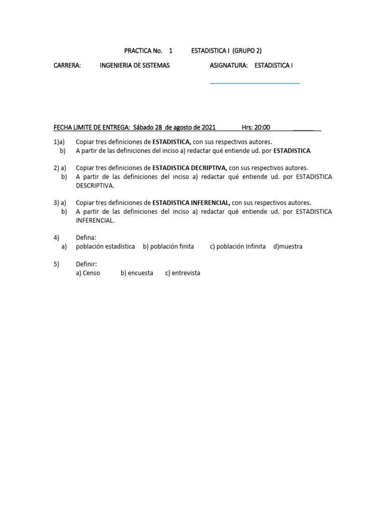 1)a) Copiar tres definiciones de ESTADISTICA, con sus respectivos autores.
