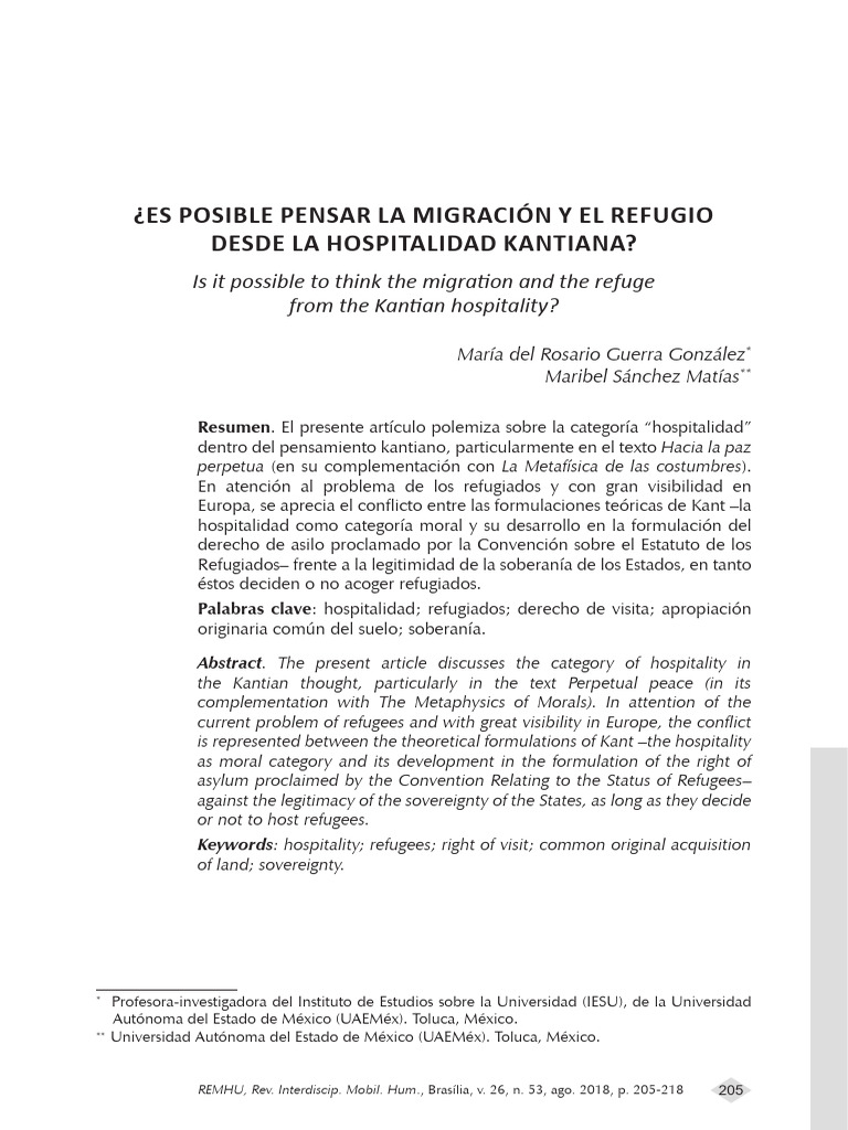 Palabras clave: hospitalidad; refugiados; derecho de visita; apropiación