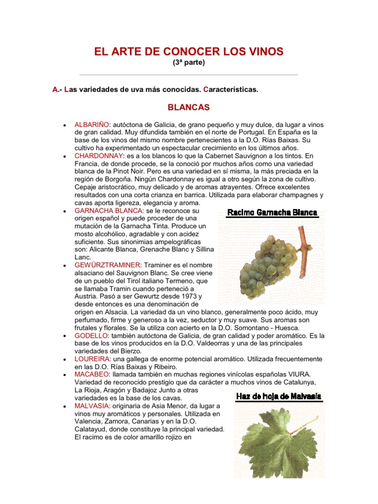 ALBARIO: autctona de Galicia, de grano pequeo y muy dulce, da lugar a vinos de gran calidad. Muy difundida tambin en el norte de Portugal. En Espaa es la base de los vinos del mismo nombre pertenecientes a la D.O. Ras Baixas. Su cultivo ha experimentado un espectacular crecimiento en los ltimos aos. CHARDONNAY: es a los blancos lo que la Cabernet Sauvignon a los tintos. En Francia, de donde procede, se la conoci por muchos aos como una variedad blanca de la Pinot Noir. Pero es una variedad en s misma, la ms preciada en la regin de Borgoa. Ningn Chardonnay es igual a otro segn la zona de cultivo. Cepaje aristocrtico, muy delicado y de aromas atrayentes. Ofrece excelentes resultados con una corta crianza en barrica. Utilizada para elaborar champagnes y cavas aporta ligereza, elegancia y aroma. GARNACHA BLANCA: se le reconoce su origen espaol y puede proceder de una mutacin de la Garnacha Tinta. Produce un mosto alcohlico, agradable y con acidez suficiente. Sus sinonimias ampelogrficas son: Alicante Blanca, Grenache Blanc y Sillina Lanc. GEWRZTRAMINER: Traminer es el nombre alsaciano del Sauvignon Blanc. Se cree viene de un pueblo del Tirol italiano Termeno, que se llamaba Tramin cuando perteneci a Austria. Pas a ser Gewurtz desde 1973 y desde entonces es una denominacin de origen en Alsacia. La variedad da un vino blanco, generalmente poco cido, muy perfumado, firme y generoso a la vez, seductor y muy suave. Sus aromas son frutales y florales. Se la utiliza con acierto en la D.O. Somontano - Huesca. GODELLO: tambin autctona de Galicia, de gran calidad y poder aromtico. Es la base de los vinos producidos en la D.O. Valdeorras y una de las principales variedades del Bierzo. LOUREIRA: una gallega de enorme potencial aromtico. Utilizada frecuentemente en las D.O. Ras Baixas y Ribeiro. MACABEO: llamada tambin en muchas regiones vincolas espaolas VIURA. Variedad de reconocido prestigio que da carcter a muchos vinos de Catalunya, La Rioja, Aragn y Badajoz Junto a otras variedades es la base de los cavas. MALVASIA: originaria de Asia Menor, da lugar a vinos muy aromticos y personales. Utilizada en Valencia, Zamora, Canarias y en la D.O. Calatayud, donde constituye la principal variedad. El racimo es de color amarillo rojizo en