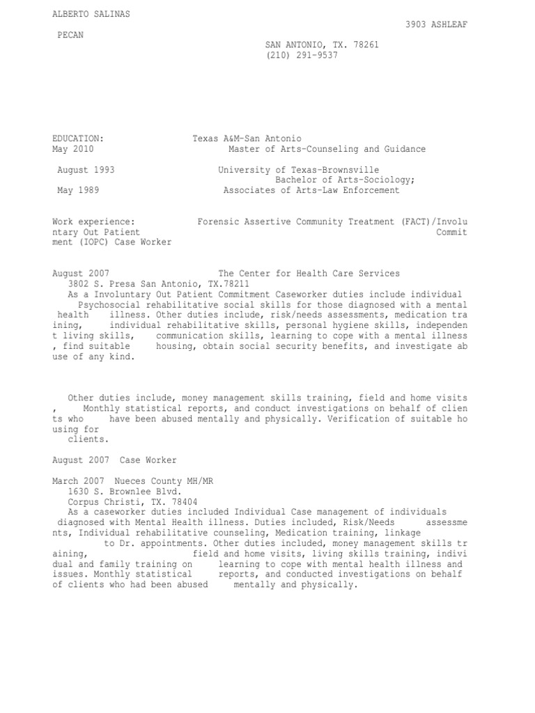 Other duties include, money management skills training, field and home visits , Monthly statistical reports, and conduct investigations on behalf of clien ts who have been abused mentally and physically. Verification of suitable ho using for clients. August 2007 Case Worker March 2007 Nueces County MH/MR 1630 S. Brownlee Blvd. Corpus Christi, TX. 78404 As a caseworker duties included Individual Case management of individuals diagnosed with Mental Health illness. Duties included, Risk/Needs assessme nts, Individual rehabilitative counseling, Medication training, linkage to Dr. appointments. Other duties included, money management skills tr aining, field and home visits, living skills training, indivi dual and family training on learning to cope with mental health illness and issues. Monthly statistical reports, and conducted investigations on behalf of clients who had been abused mentally and physically.