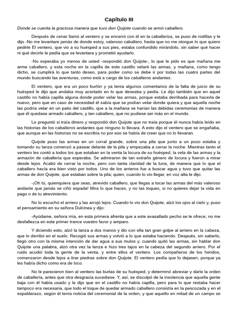favor de haberlo armado caballero. El ventero, por verlo ya fuera de allí, con breves palabras, respondió