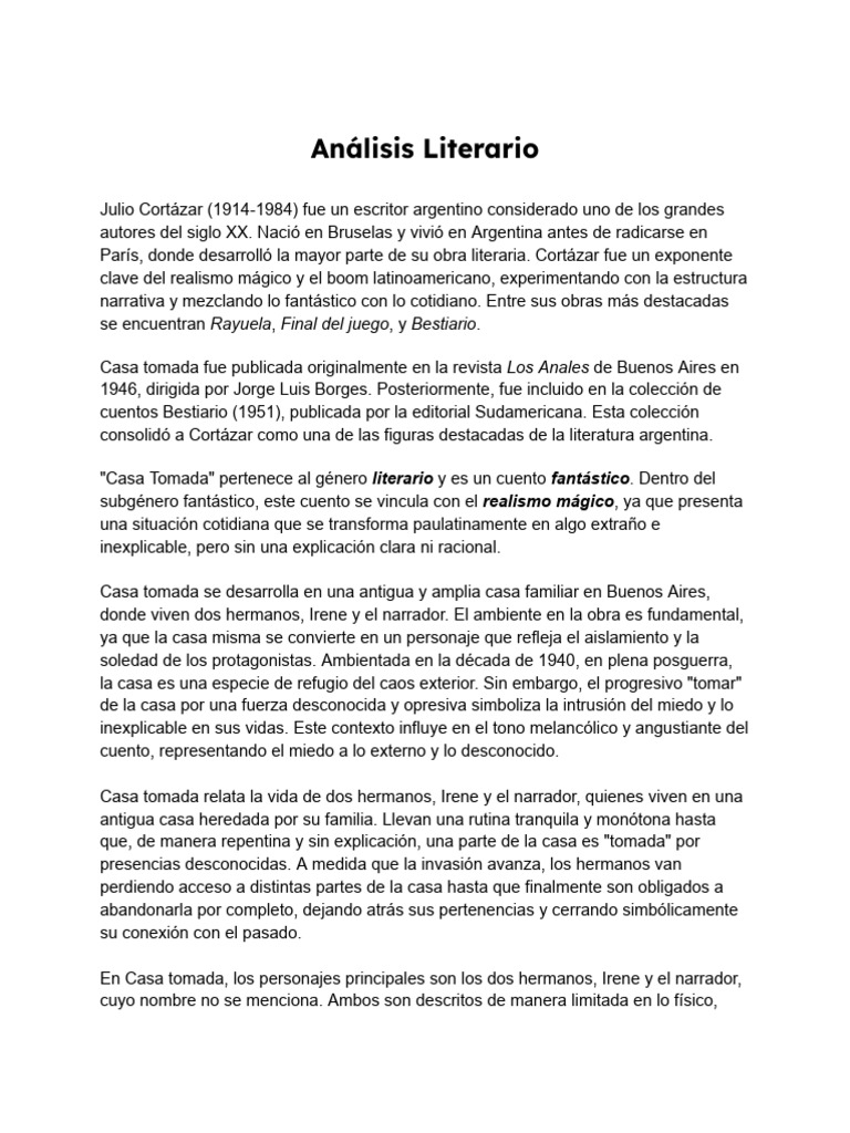 "Casa Tomada" pertenece al género literario y es un cuento fantástico. Dentro del