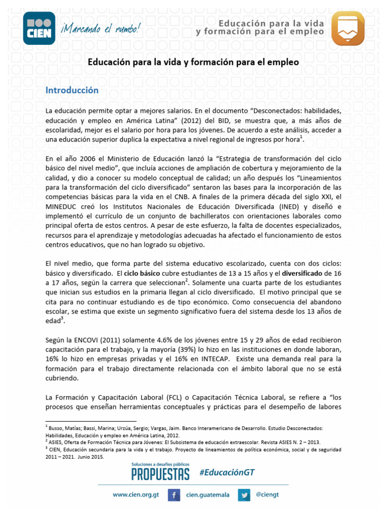 CIEN, Educación secundaria para la vida y el trabajo. Proyecto de lineamientos de política económica, social y de seguridad