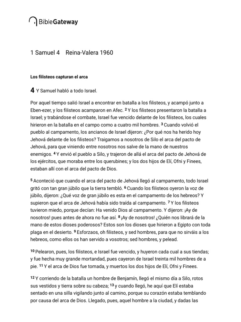 pie. 11 Y el arca de Dios fue tomada, y muertos los dos hijos de Elí, Ofni y Finees.