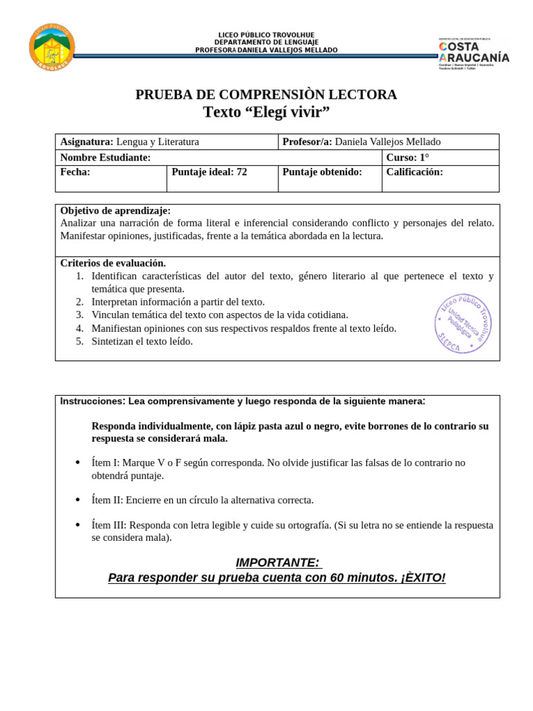 Instrucciones: Lea comprensivamente y luego responda de la siguiente manera: