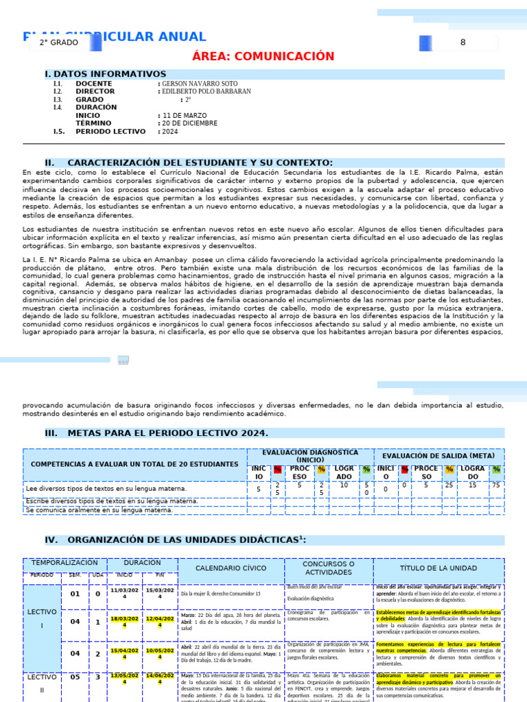 Plan Curricular Anual 2024: Comunicación 2° Grado