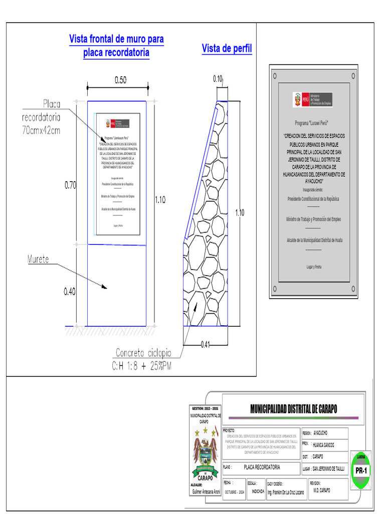 PLANO : PLACA RECORDATORIA LUGAR : SAN JERONIMO DE TAULLI