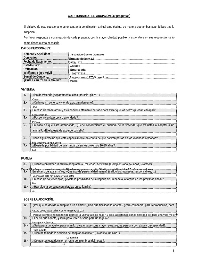 etc..), si los compró o los adoptó, dónde los adoptó..