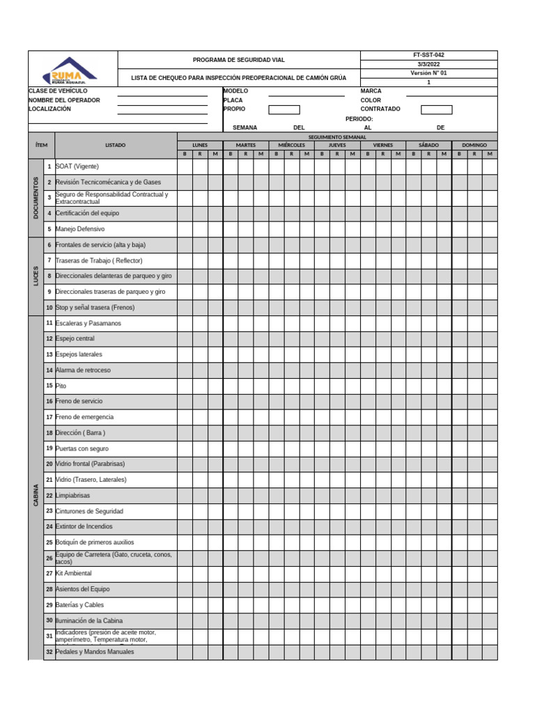 LISTA DE CHEQUEO PARA INSPECCIÓN PREOPERACIONAL DE CAMIÓN GRÚA
