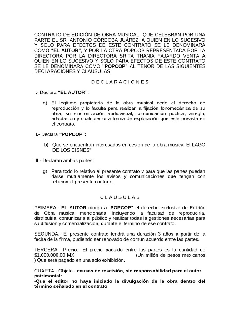 CONTRATO DE EDICIÓN DE OBRA MUSICAL QUE CELEBRAN POR UNA