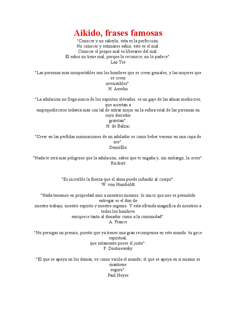 "Conocer y no saberlo, sta es la perfeccin. No conocer y estimarse sabio, ste es el mal. Conocer el propio mal es liberarse del mal. El sabio no tiene mal, porque lo reconoce, no lo padece". Lao Ts "Las personas ms insoportables son los hombres que se creen geniales, y las mujeres que se creen irresistibles". H. Asselin "La adulacin no llega nunca de los espritus elevados: es un gaje de las almas mediocres, que aciertan a empequeecerse todava ms con tal de entrar mejor en la esfera vital de las personas en cuyo derredor gravitan". H. de Balzac "Creer en las prfidas insinuaciones de un adulador es como beber veneno en una copa de oro". Demfilo "Nada te ser ms peligroso que la adulacin; sabes que te engaa y, sin embargo, la crees". Rckert "Es increble la fuerza que el alma puede infundir al cuerpo". W. von Humboldt "Nada tenemos en propiedad sino a nosotros mismos: lo nico que nos es permitido entregar es el don de nuestro trabajo, nuestro espritu y nuestro ingenio. Y esta ofrenda magnfica de nosotros a todos los hombres enriquece tanto al donador como a la comunidad". A. France "No persigas un premio, puesto que ya tienes una gran recompensa en este mundo: tu goce espiritual, que solamente posee el justo". F. Dostoiewsky "El que se apoya en los dems, ve como vacila el mundo; el que se apoya en s mismo se mantiene seguro". Paul Heyse