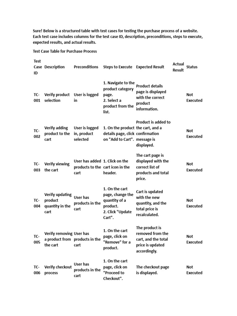 may want to test. Each test case is designed to cover different aspects of the purchase process to