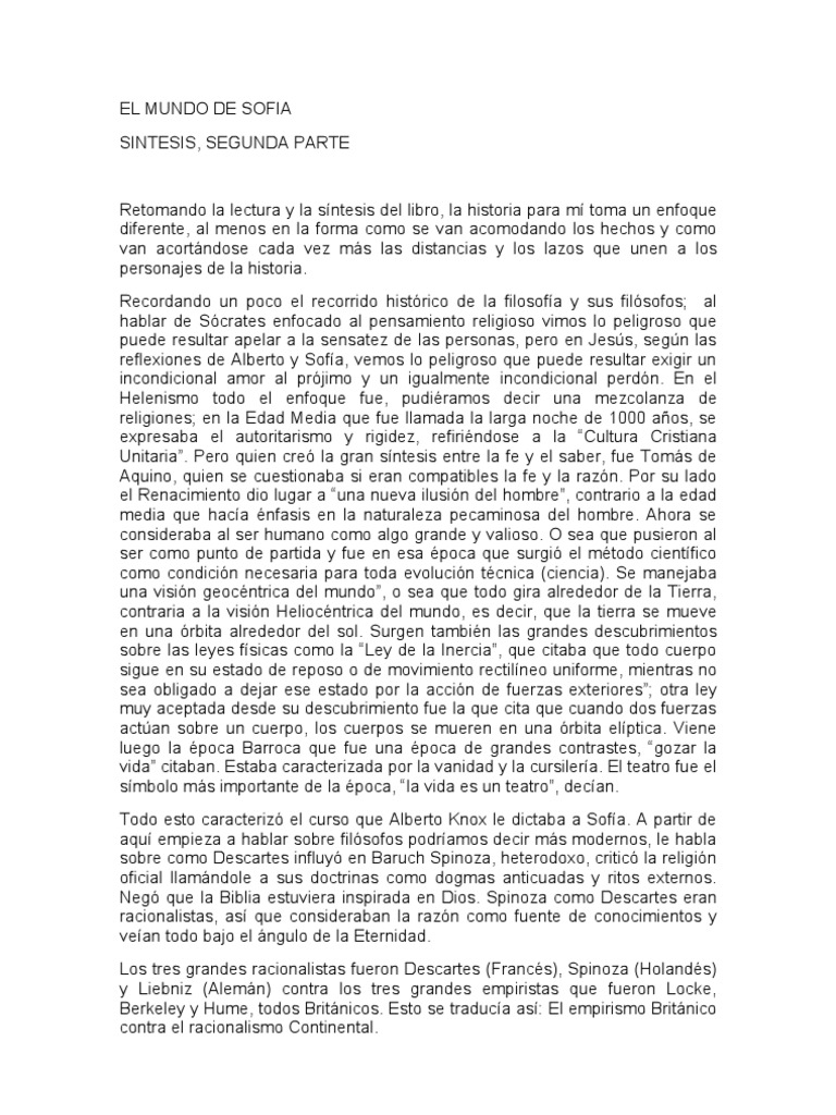 Retomando la lectura y la sntesis del libro, la historia para m toma un enfoque diferente, al menos en la forma como se van acomodando los hechos y como van acortndose cada vez ms las distancias y los lazos que unen a los personajes de la historia. Recordando un poco el recorrido histrico de la filosofa y sus filsofos; al hablar de Scrates enfocado al pensamiento religioso vimos lo peligroso que puede resultar apelar a la sensatez de las personas, pero en Jess, segn las reflexiones de Alberto y Sofa, vemos lo peligroso que puede resultar exigir un incondicional amor al prjimo y un igualmente incondicional perdn. En el Helenismo todo el enfoque fue, pudiramos decir una mezcolanza de religiones; en la Edad Media que fue llamada la larga noche de 1000 aos, se expresaba el autoritarismo y rigidez, refirindose a la Cultura Cristiana Unitaria. Pero quien cre la gran sntesis entre la fe y el saber, fue Toms de Aquino, quien se cuestionaba si eran compatibles la fe y la razn. Por su lado el Renacimiento dio lugar a una nueva ilusin del hombre, contrario a la edad media que haca nfasis en la naturaleza pecaminosa del hombre. Ahora se consideraba al ser humano como algo grande y valioso. O sea que pusieron al ser como punto de partida y fue en esa poca que surgi el mtodo cientfico como condicin necesaria para toda evolucin tcnica (ciencia). Se manejaba una visin geocntrica del mundo, o sea que todo gira alrededor de la Tierra, contraria a la visin Heliocntrica del mundo, es decir, que la tierra se mueve en una rbita alrededor del sol. Surgen tambin las grandes descubrimientos sobre las leyes fsicas como la Ley de la Inercia, que citaba que todo cuerpo sigue en su estado de reposo o de movimiento rectilneo uniforme, mientras no sea obligado a dejar ese estado por la accin de fuerzas exteriores; otra ley muy aceptada desde su descubrimiento fue la que cita que cuando dos fuerzas actan sobre un cuerpo, los cuerpos se mueren en una rbita elptica. Viene luego la poca Barroca que fue una poca de grandes contrastes, gozar la vida citaban. Estaba caracterizada por la vanidad y la cursilera. El teatro fue el smbolo ms importante de la poca, la vida es un teatro, decan. Todo esto caracteriz el curso que Alberto Knox le dictaba a Sofa. A partir de aqu empieza a hablar sobre filsofos podramos decir ms modernos, le habla sobre como Descartes influy en Baruch Spinoza, heterodoxo, critic la religin oficial llamndole a sus doctrinas como dogmas anticuadas y ritos externos. Neg que la Biblia estuviera inspirada en Dios. Spinoza como Descartes eran racionalistas, as que consideraban la razn como fuente de conocimientos y vean todo bajo el ngulo de la Eternidad. Los tres grandes racionalistas fueron Descartes (Francs), Spinoza (Holands) y Liebniz (Alemn) contra los tres grandes empiristas que fueron Locke, Berkeley y Hume, todos Britnicos. Esto se traduca as: El empirismo Britnico contra el racionalismo Continental.