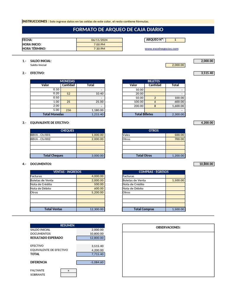 FORMATO DE ARQUEO DE CAJA DIARIO