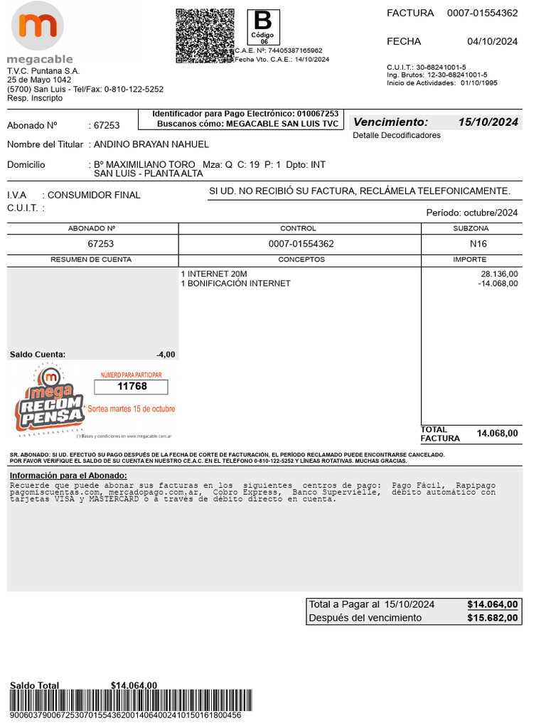 Abonado Nº : 67253 Buscanos cómo: MEGACABLE SAN LUIS TVC Vencimiento: 15/10/2024