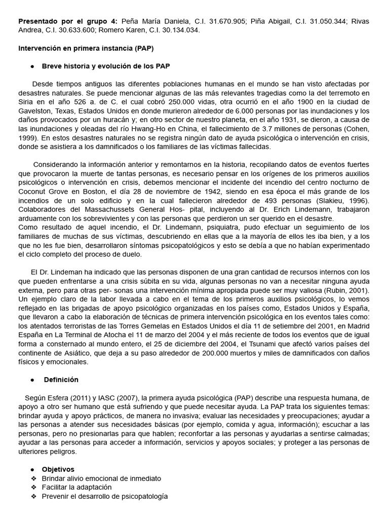 apoyo a otro ser humano que está sufriendo y que puede necesitar ayuda. La PAP trata los siguientes temas: