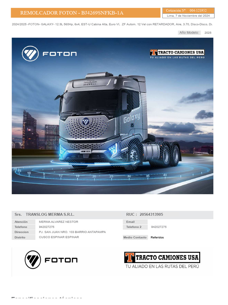 REMOLCADOR FOTON - BJ4269SNFKB-1A Lima, 7 de Noviembre del 2024