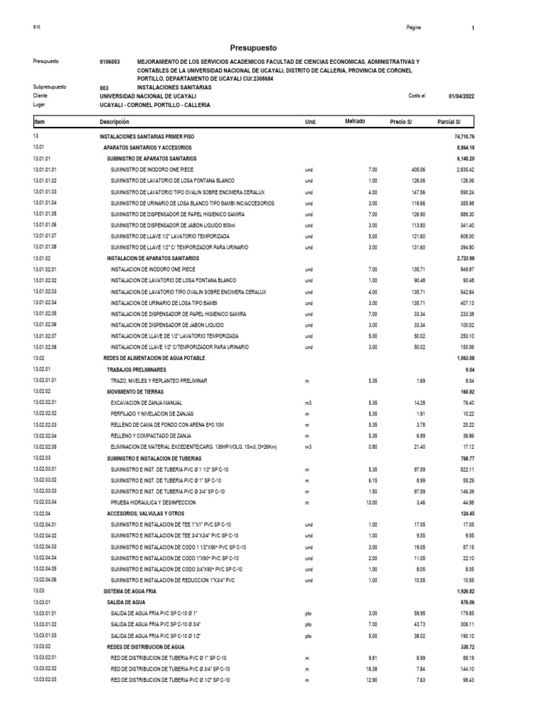Cliente UNIVERSIDAD NACIONAL DE UCAYALI Costo al 01/04/2022