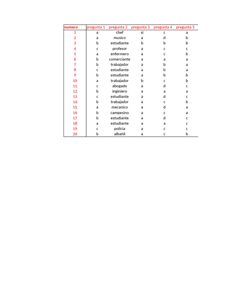 numero pregunta 1 pregunta 2 pregunta 3 pregunta 4 pregunta 5