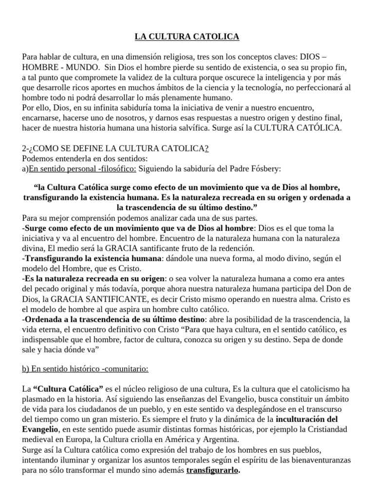 1- Lee la definición y explicación de Cultura católica y responde que beneficios trae a la