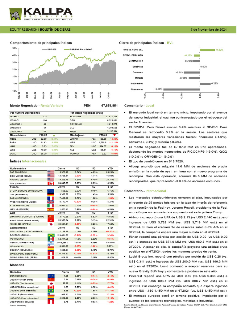 HBM USD 9.63 7.00% SPY USD 594.07 -4.18% El monto negociado fue de S/ 67.9 MM en 972 operaciones,