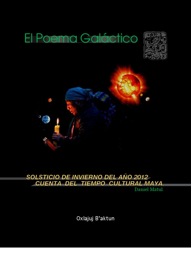 Recientemente y a propsito de la finalizacin de un ciclo, en la cuenta del Calendario Maya, de cinco mil ciento veinticinco aos, el 21 de diciembre del ao 2012, se han expresado diversas opiniones tanto en Guatemala como en diferentes partes del planeta. Ciertamente, el 21 de diciembre de 2012, en el solsticio de invierno el sol estar ubicado en la abertura de la Va Lctea, para producir un espectacular acontecimiento celeste que por su belleza hemos denominado el poema galctico del 2012. Precisamente, en el nimo de favorecer la reflexin personal o colectiva segn sea la disposicin- hemos preparado este sencillo trabajo cuyo contenido refiere aspectos relacionados con la cuenta Calendrica Maya; algunas concordancias histricas relativas al Cdice de Dresde; reflexiones del antroplogo y arquelogo ingls Eric Thomson, una de las principales autoridades del mundo occidental sobre la milenaria cultura y civilizacin maya y del irlands Maurice Cotterell, autor del Libro Las Profecas Mayas; un resumen acerca de las investigaciones llevadas a cabo por el satlite SOHO en relacin al proceso que podra poner en marcha la inversin del campo magntico del Sol en la Tierra; los juicios del Dr. Nat Gopalswamy, miembro del Goddard Space Flight Center, sobre los cambios peridicos del Sol; breve mencin a la denominada Frecuencia Schumann y los cambios magnticos en el planeta. La idea consiste invitar a la investigacin sobre lo que, segn los antepasados mayas, ocurrir en el solsticio de invierno del 2012, a fin de buscar una explicacin ms cercana a la realidad y distante de los fundamentalismos de cualquier tipo, los mesianismos y las actitudes milenaristas. Se trata de revalorar nuestra condicin humana en la tierra en momentos en que nos encontramos vulnerables, por cuanto las ideas y el modelo de desarrollo que cre la poca de la industria, se encuentra en crisis irreversible.