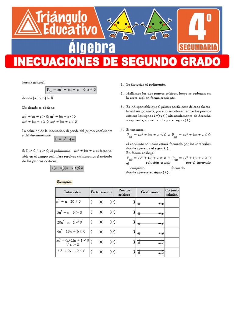 able en el campo real. Para resolver utilizaremos el método P(x) = ax2 + bx + c > 0 ∨ P(x) = ax2 + bx + c ≥ 0