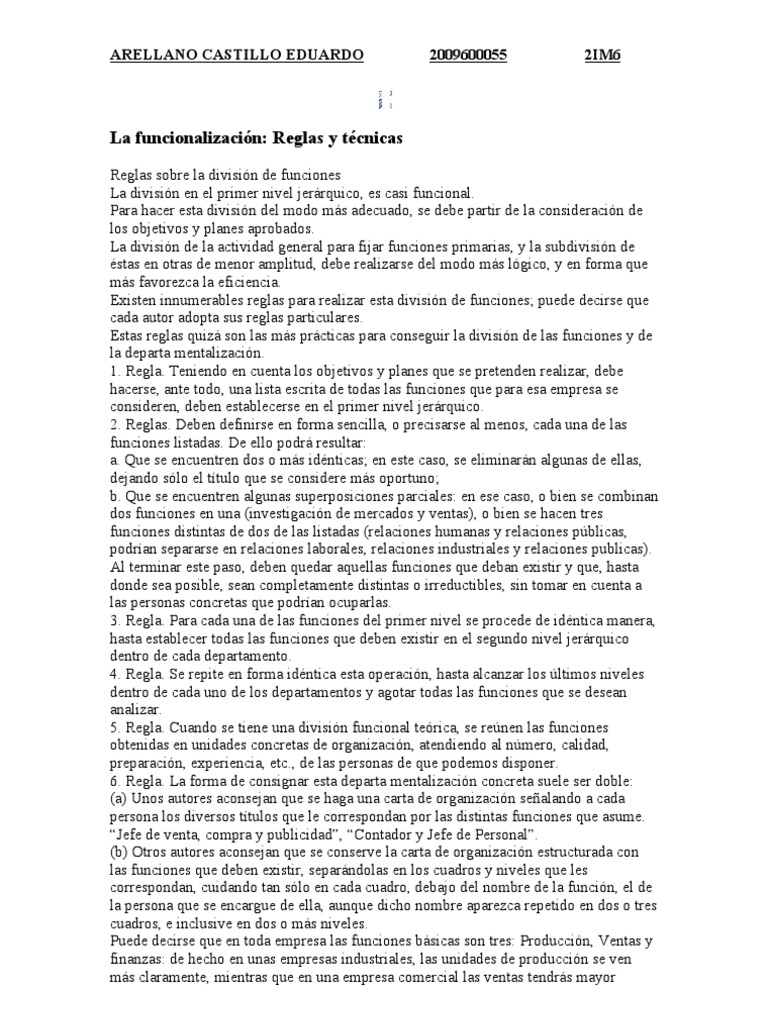 Reglas sobre la divisin de funciones La divisin en el primer nivel jerrquico, es casi funcional. Para hacer esta divisin del modo ms adecuado, se debe partir de la consideracin de los objetivos y planes aprobados. La divisin de la actividad general para fijar funciones primarias, y la subdivisin de stas en otras de menor amplitud, debe realizarse del modo ms lgico, y en forma que ms favorezca la eficiencia. Existen innumerables reglas para realizar esta divisin de funciones; puede decirse que cada autor adopta sus reglas particulares. Estas reglas quiz son las ms prcticas para conseguir la divisin de las funciones y de la departa mentalizacin. 1. Regla. Teniendo en cuenta los objetivos y planes que se pretenden realizar, debe hacerse, ante todo, una lista escrita de todas las funciones que para esa empresa se consideren, deben establecerse en el primer nivel jerrquico. 2. Reglas. Deben definirse en forma sencilla, o precisarse al menos, cada una de las funciones listadas. De ello podr resultar: a. Que se encuentren dos o ms idnticas; en este caso, se eliminarn algunas de ellas, dejando slo el ttulo que se considere ms oportuno; b. Que se encuentren algunas superposiciones parciales: en ese caso, o bien se combinan dos funciones en una (investigacin de mercados y ventas), o bien se hacen tres funciones distintas de dos de las listadas (relaciones humanas y relaciones pblicas, podran separarse en relaciones laborales, relaciones industriales y relaciones publicas). Al terminar este paso, deben quedar aquellas funciones que deban existir y que, hasta donde sea posible, sean completamente distintas o irreductibles, sin tomar en cuenta a las personas concretas que podran ocuparlas. 3. Regla. Para cada una de las funciones del primer nivel se procede de idntica manera, hasta establecer todas las funciones que deben existir en el segundo nivel jerrquico dentro de cada departamento. 4. Regla. Se repite en forma idntica esta operacin, hasta alcanzar los ltimos niveles dentro de cada uno de los departamentos y agotar todas las funciones que se desean analizar. 5. Regla. Cuando se tiene una divisin funcional terica, se renen las funciones obtenidas en unidades concretas de organizacin, atendiendo al nmero, calidad, preparacin, experiencia, etc., de las personas de que podemos disponer. 6. Regla. La forma de consignar esta departa mentalizacin concreta suele ser doble: (a) Unos autores aconsejan que se haga una carta de organizacin sealando a cada persona los diversos ttulos que le correspondan por las distintas funciones que asume. Jefe de venta, compra y publicidad, Contador y Jefe de Personal. (b) Otros autores aconsejan que se conserve la carta de organizacin estructurada con las funciones que deben existir, separndolas en los cuadros y niveles que les correspondan, cuidando tan slo en cada cuadro, debajo del nombre de la funcin, el de la persona que se encargue de ella, aunque dicho nombre aparezca repetido en dos o tres cuadros, e inclusive en dos o ms niveles. Puede decirse que en toda empresa las funciones bsicas son tres: Produccin, Ventas y finanzas: de hecho en unas empresas industriales, las unidades de produccin se ven ms claramente, mientras que en una empresa comercial las ventas tendrs mayor