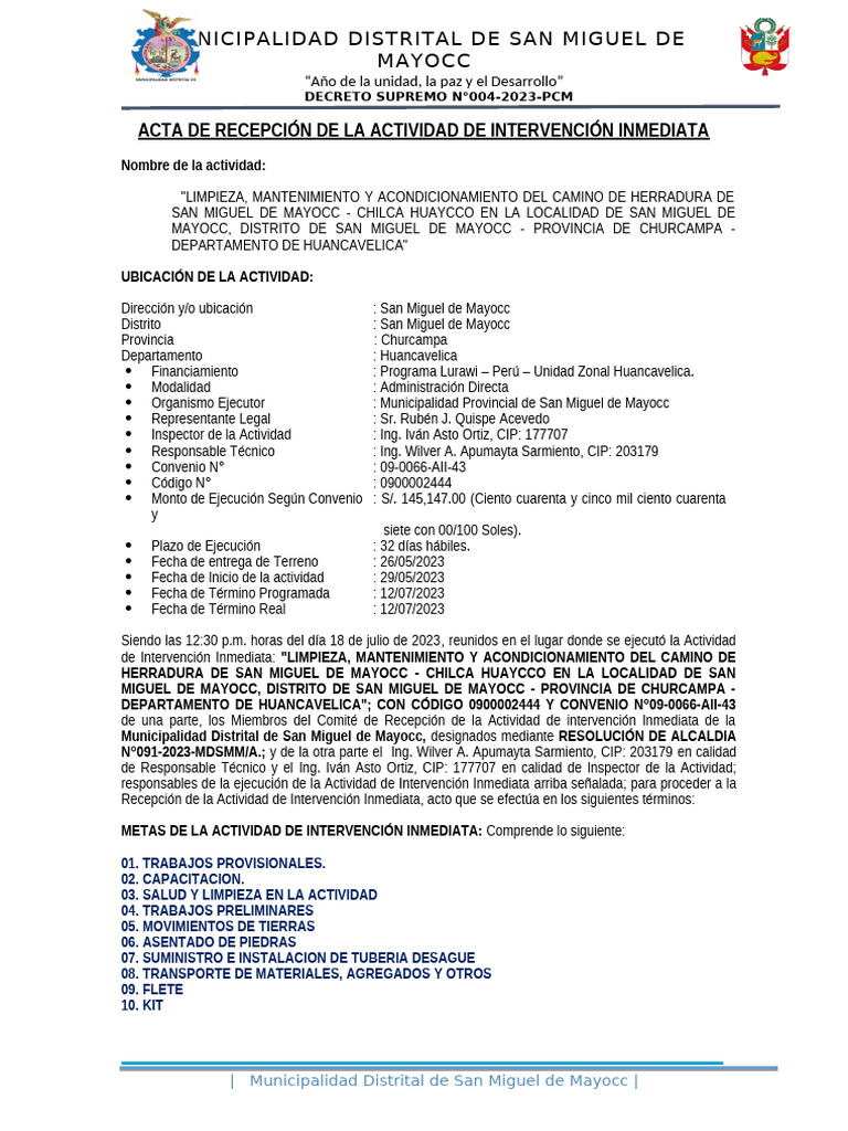 p.m. del día 18 de julio de 2023, Se culminó con la inspección ocular para la Recepción de la Actividad de