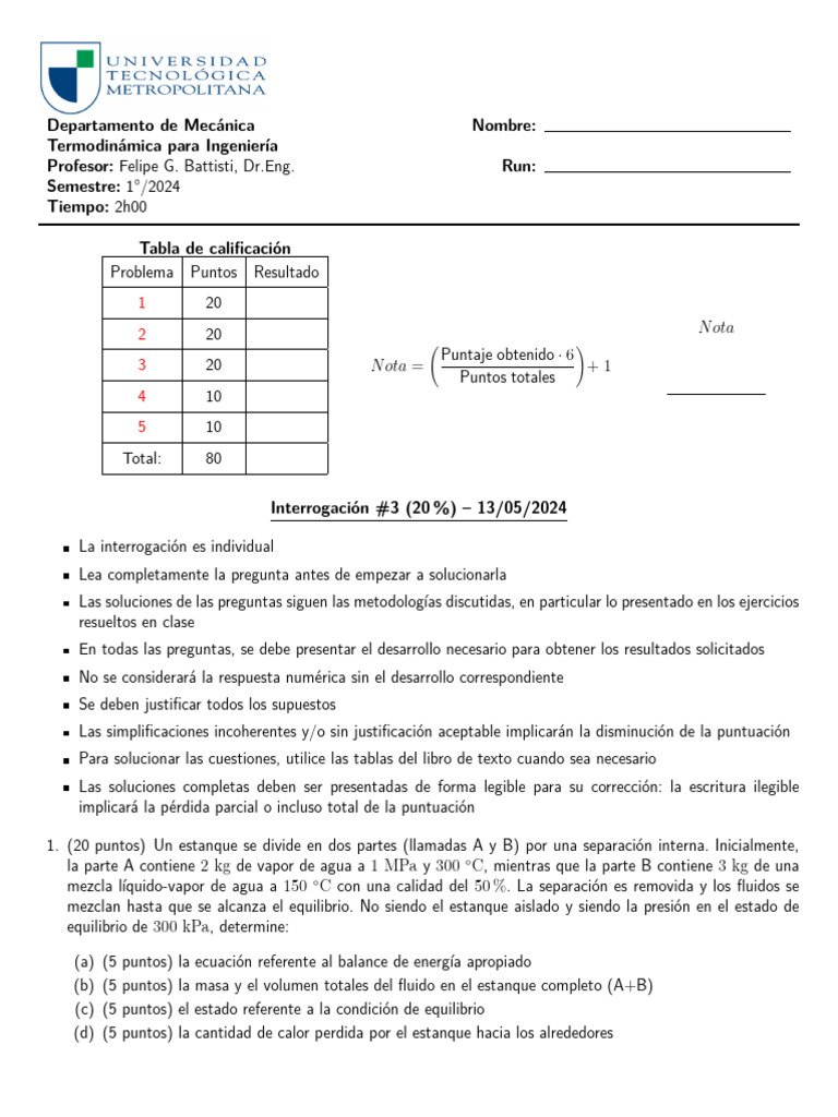 1. (20 puntos) Un estanque se divide en dos partes (llamadas A y B) por una separación interna. Inicialmente,