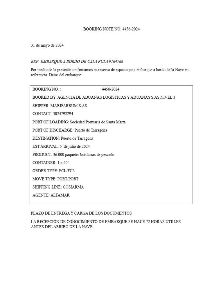 BOOKED BY: AGENCIA DE ADUANAS LOGÍSTICAS Y ADUANAS S.AS NIVEL 3