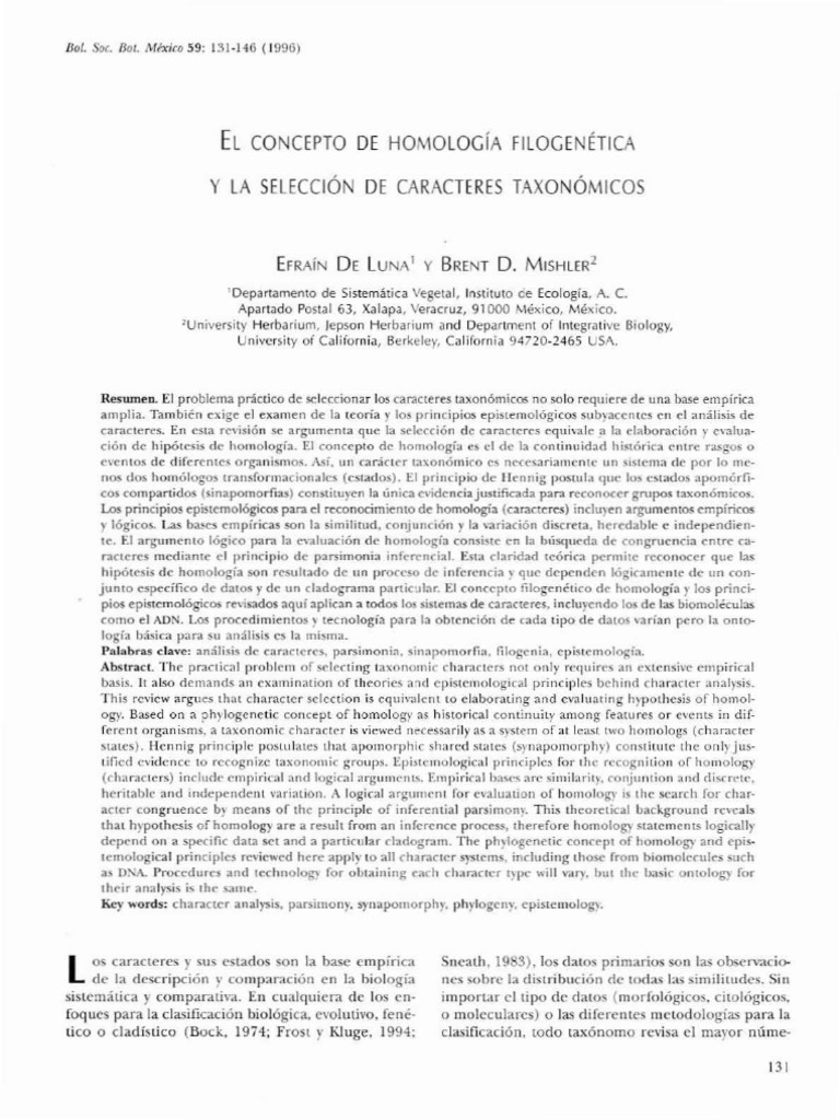 Mishlcr B.O. \ ¡le Luna E. 199i. Sislemática filogenética y (Edr.) lJomofog;. 1'ht hítrarc:hicaf ba.sÍ$ o/ eomparaliw 6;0--