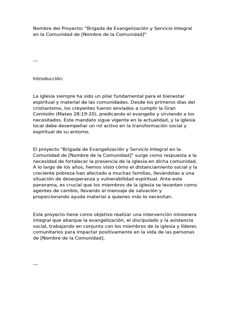 Nombre del Proyecto: "Brigada de Evangelización y Servicio Integral