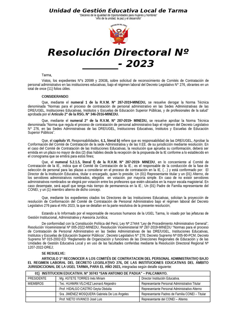 resolución de Conformación del Comité de Contratación de Personal Administrativo bajo el régimen laboral del Decreto