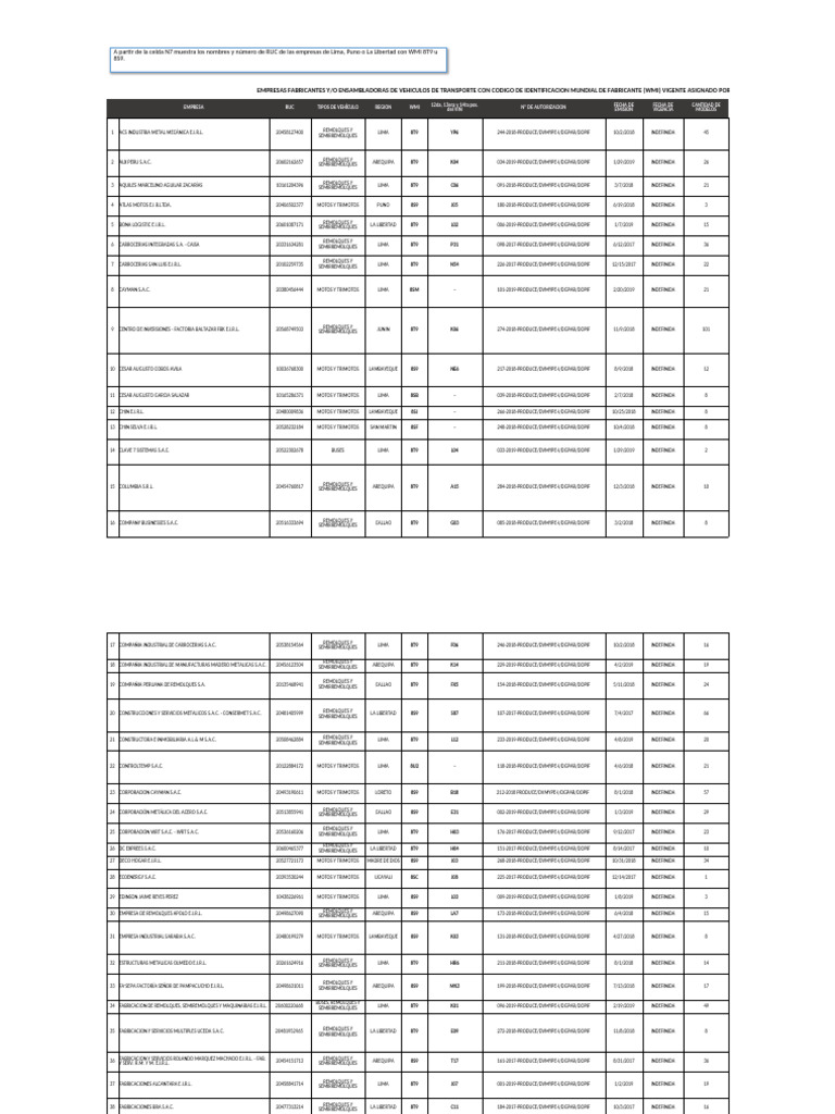 EMPRESAS FABRICANTES Y/O ENSAMBLADORAS DE VEHICULOS DE TRANSPORTE CON CODIGO DE IDENTIFICACION MUNDIAL DE FABRICANTE (WMI) VIGENTE ASIGNADO POR PRODUCE