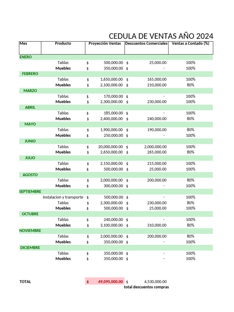 Mes Producto Proyección Ventas Descuentos Comerciales Ventas a Contado (%)