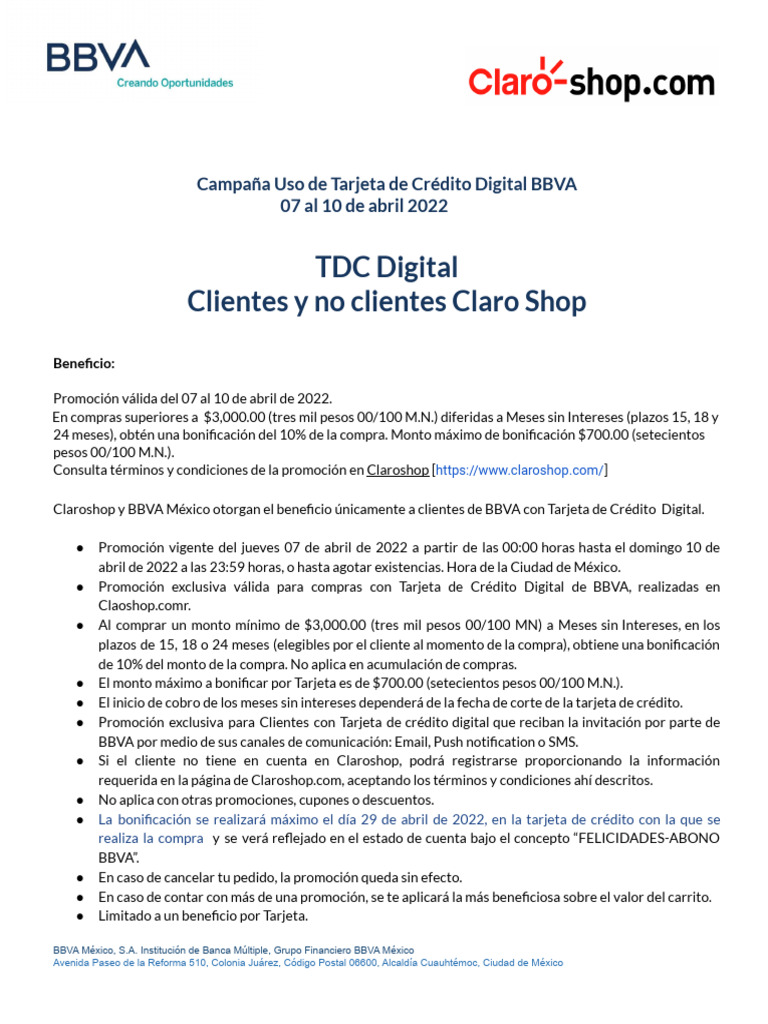 Claroshop y BBVA México otorgan el beneficio únicamente a clientes de BBVA con Tarjeta de Crédito Digital.