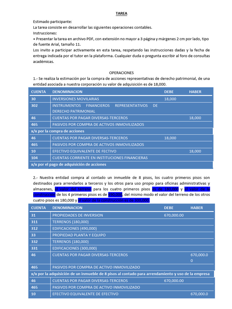 La tarea consiste en desarrollar las siguientes operaciones contables.