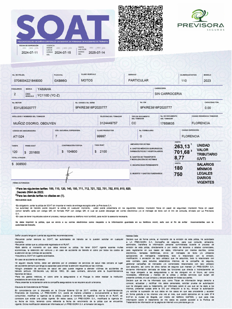•Es obligatorio portar la póliza de SOAT sin importar el medio de entrega escogido ante La Previsora S.A.