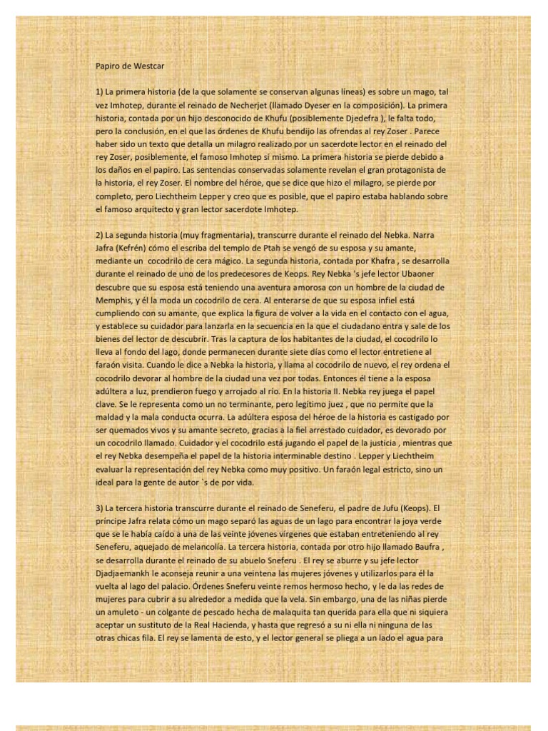 permitir la recuperacin del amuleto, luego se dobla la parte posterior del agua. En la historia III. rey Snefru se convierte en una vctima de la valenta del autor `s para criticar a la monarqua como tal. l representa a Esnofru como un tonto necio, que es fcil de contentar con el entretenimiento superficial y que es incapaz de resolver una disputa con una criada de remo poco. Sneferu adicional debe tener un sacerdote para que venga a deshacerse de sus problemas. Con este curso de la narracin y la representacin de un faran vergonzoso el autor de Westcar se atreve a criticar a los faraones de Egipto, como tal, y hace que la historia III. convertido en una especie de stira . Lepper seala, que los crticos estn escondidos inteligentemente sin embargo -. No es de extraar ya que el autor tuvo que ser cuidadosos, porque el Papiro Westcar se hizo posible para los espectculos pblicos, o, al menos, hecho para el estudio de pblicos 4) La cuarta historia sucede en la corte, con el mago Dyedi. Trata de cmo el mago Dyedi, delante del rey Jufu y su hijo Dyedefhor, resucita a un pato previamente decapitado. Tambin de los secretos del dios Dyehuty (Thot). La cuarta historia, contada por Hordjedef, se refiere a un milagro que dentro de propio reinado de Keops. Un habitante de la ciudad llamado Dedi aparentemente tiene el poder para volver a colocar una cabeza cortada en un animal, salvaje para domar leones, y sabe el nmero de habitaciones secretas en el santuario de Thoth . Keops, intrigado, enva a su hijo para invitar a este hombre sabio, y al llegar Dedi en la corte ordena a un ganso, un indefinido de aves acuticas, y un toro degollado. Dedi vuelve a pegar la cabeza. Khufu se le pregunta sobre su conocimiento en el santuario de Thoth, y las respuestas Dedi que no sabe el nmero de habitaciones, pero l sabe dnde estn. Cuando Keops pide la Wheres y los cmo, Dedi respuestas que el que puede dar acceso a Keops no es l, pero el primero de los tres futuros reyes en el vientre de la mujer Rededjet. Esta es una profeca que detalla los inicios de la dinasta V, a partir de Userkaf. 5) La quinta historia es una prediccin sobre los orgenes de los reyes de la dinasta V. Donde el rey Jufu se entera, por la profeca del mago Dyedi, cmo Userkaf, Sahura y Neferirkara (Kaka), los hijos de Rudydyedet, la esposa del sumo sacerdote de Ra, Sajebu (Reuser), llegaran a ser los tres reyes de Egipto, uno tras otro, y lo que aconteci. La ltima historia, rompe con el formato y el enfoque se desplaza al dar a luz Rededjet a sus tres hijos. En el da de nacimiento de sus hijos, Ra rdenes de Isis, Neftis , Meskhenet , Heket y Khnum en su ayuda. Se disfrazan de msicos y prisa a la casa de Reddedet para ayudarla con el nacimiento difcil. Los tres nios que nacen, cada uno descrito como fuerte y sano, con las extremidades cubiertas de oro y tocados de lapislzuli. La criada de Rededjet tarde tiene una discusin con su seora, recibe una paliza y huye, y prometi decirle a rey Keops lo que haba sucedido. Pero en el camino, se encuentra con su hermano y cuenta la historia de l. Enfadado, le pega, demasiado, y que hace que ella vaya a la orilla del mar donde un cocodrilo a su captura. El hermano se va a ver a Rededjet, que est llorando por la prdida de la nia. El hermano comienza a confesar lo que ha sucedido y en este punto termina el papiro. a quinta y ltima historia habla de la Rededjet hroe femenino (su nombre es tambin a menudo se leen como Ruddedet) y su difcil nacimiento de tres hijos. Dios del sol Ra las rdenes de sus compaeros, Isis, Meskhenet, Hekhet, Neftis y Khnum para ayudar a Rededjet, para asegurar el nacimiento de los trillizos y el comienzo de una nueva dinasta. Lepper y Liechtheim evaluar tanto la historia como una especie de narr moral que trata el tema de la justicia y lo que ocurre con los traidores .
