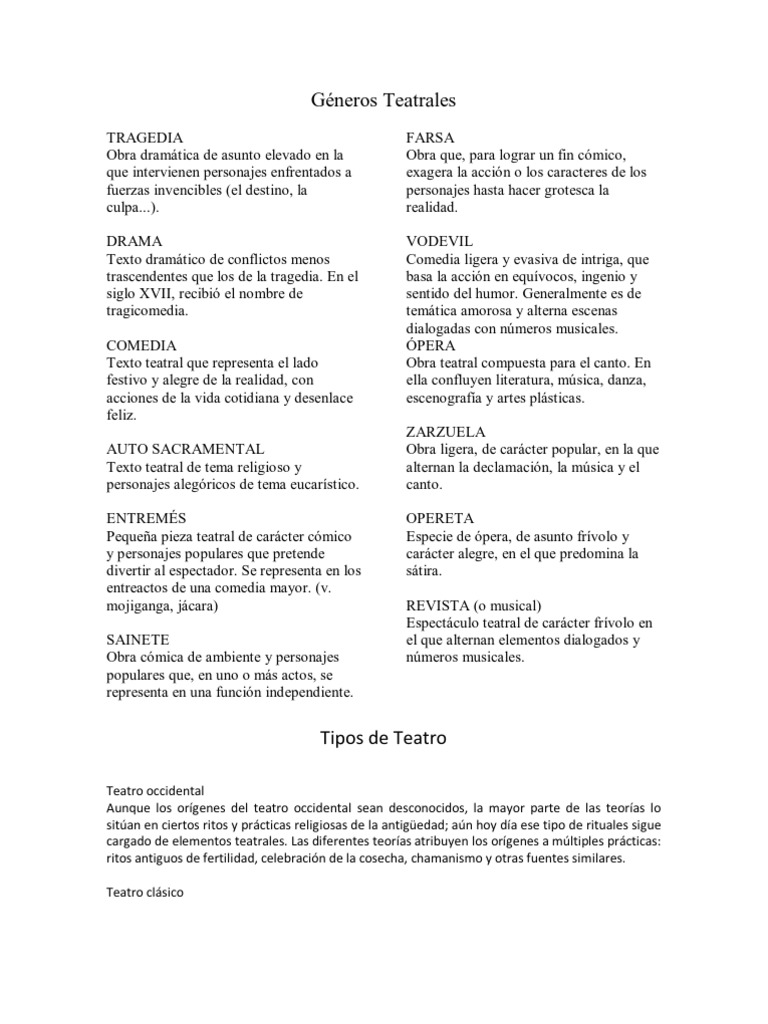 TRAGEDIA Obra dramtica de asunto elevado en la que intervienen personajes enfrentados a fuerzas invencibles (el destino, la culpa...). DRAMA Texto dramtico de conflictos menos trascendentes que los de la tragedia. En el siglo XVII, recibi el nombre de tragicomedia. COMEDIA Texto teatral que representa el lado festivo y alegre de la realidad, con acciones de la vida cotidiana y desenlace feliz. AUTO SACRAMENTAL Texto teatral de tema religioso y personajes alegricos de tema eucarstico. ENTREMS Pequea pieza teatral de carcter cmico y personajes populares que pretende divertir al espectador. Se representa en los entreactos de una comedia mayor. (v. mojiganga, jcara) SAINETE Obra cmica de ambiente y personajes populares que, en uno o ms actos, se representa en una funcin independiente. FARSA Obra que, para lograr un fin cmico, exagera la accin o los caracteres de los personajes hasta hacer grotesca la realidad. VODEVIL Comedia ligera y evasiva de intriga, que basa la accin en equvocos, ingenio y sentido del humor. Generalmente es de temtica amorosa y alterna escenas dialogadas con nmeros musicales. PERA Obra teatral compuesta para el canto. En ella confluyen literatura, msica, danza, escenografa y artes plsticas. ZARZUELA Obra ligera, de carcter popular, en la que alternan la declamacin, la msica y el canto. OPERETA Especie de pera, de asunto frvolo y carcter alegre, en el que predomina la stira. REVISTA (o musical) Espectculo teatral de carcter frvolo en el que alternan elementos dialogados y nmeros musicales.