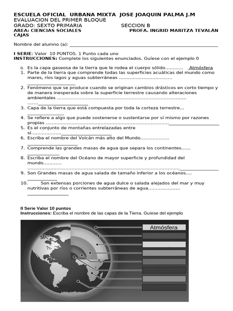 Instrucciones: Escriba el nombre de las capas de la Tierra. Guíese del ejemplo