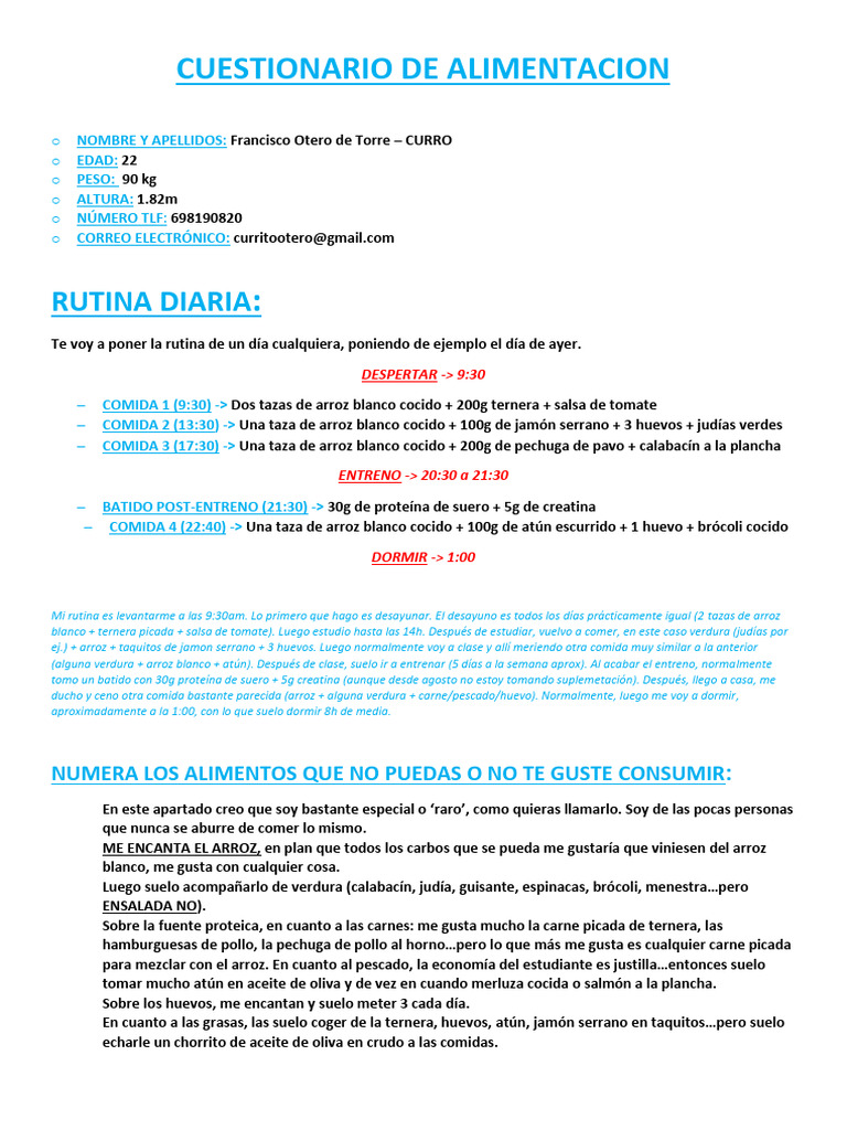 (alguna verdura + arroz blanco + atún). Después de clase, suelo ir a entrenar (5 días a la semana aprox). Al acabar el entreno, normalmente