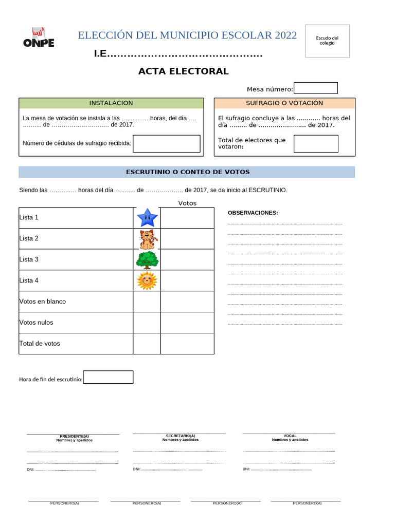 Siendo las ………..… horas del día ……..... de …………….… de 2017, se da inicio al ESCRUTINIO.