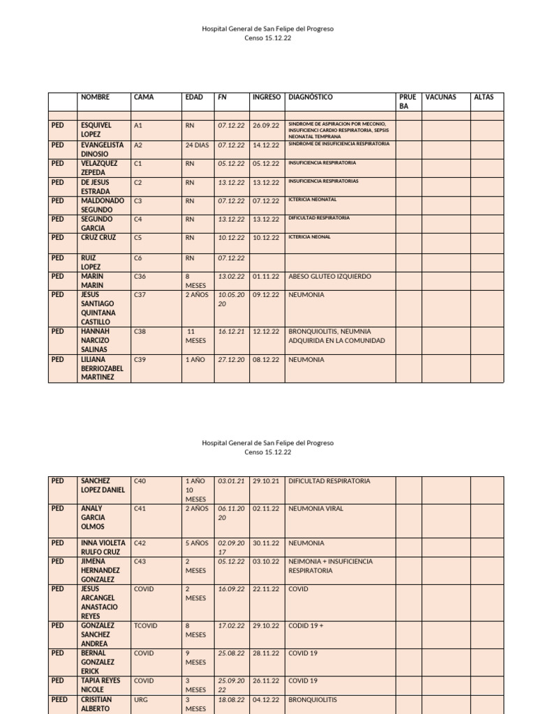 NOMBRE CAMA EDAD FN INGRESO DIAGNÓSTICO PRUE VACUNAS ALTAS