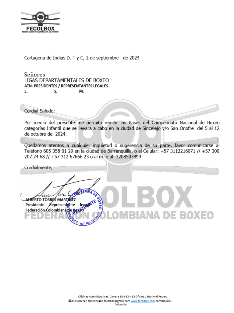 Por medio del presente me permito remitir las Bases del Campeonato Nacional de Boxeo