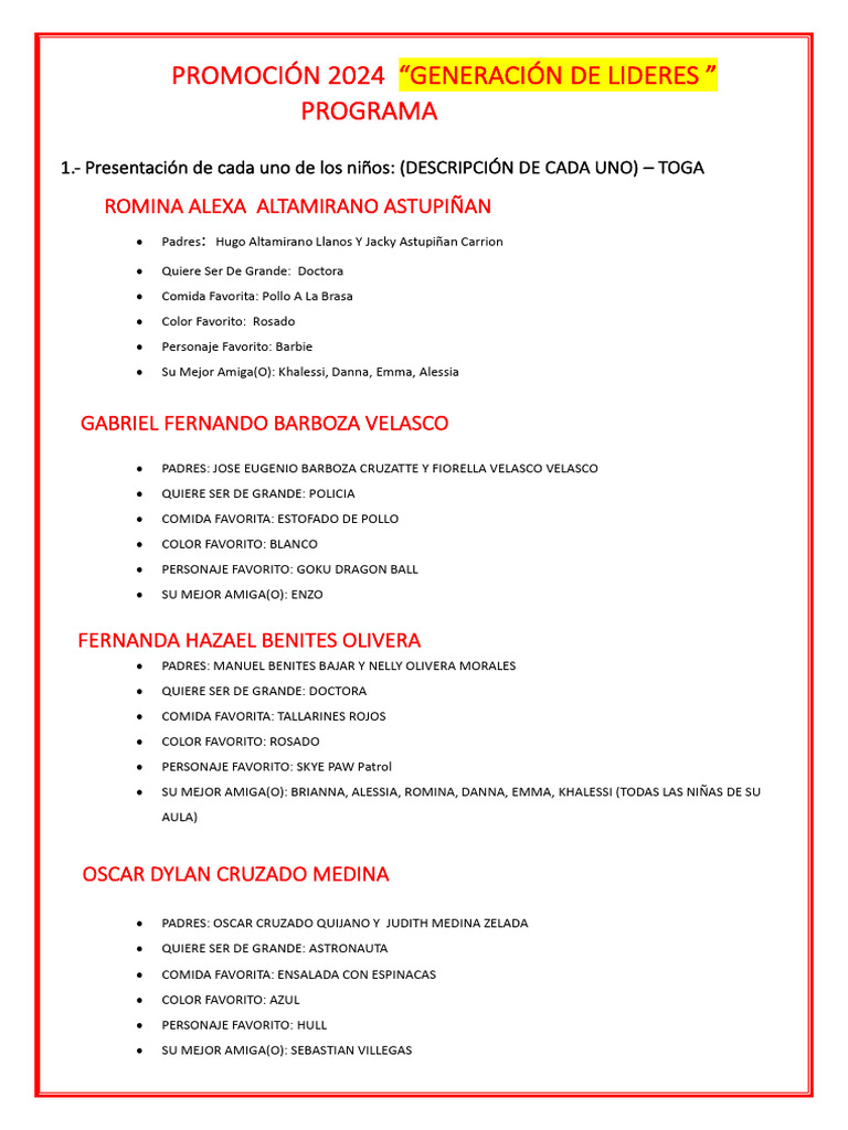 1.- Presentación de cada uno de los niños: (DESCRIPCIÓN DE CADA UNO) – TOGA