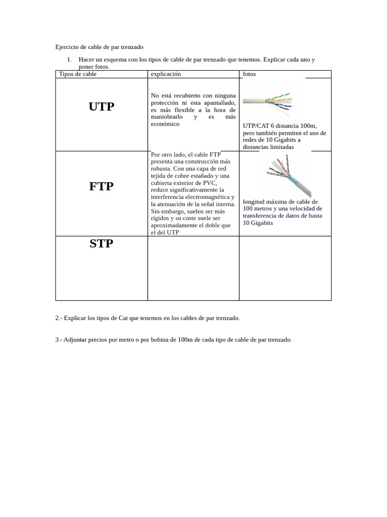 1. Hacer un esquema con los tipos de cable de par trenzado que tenemos. Explicar cada uno y