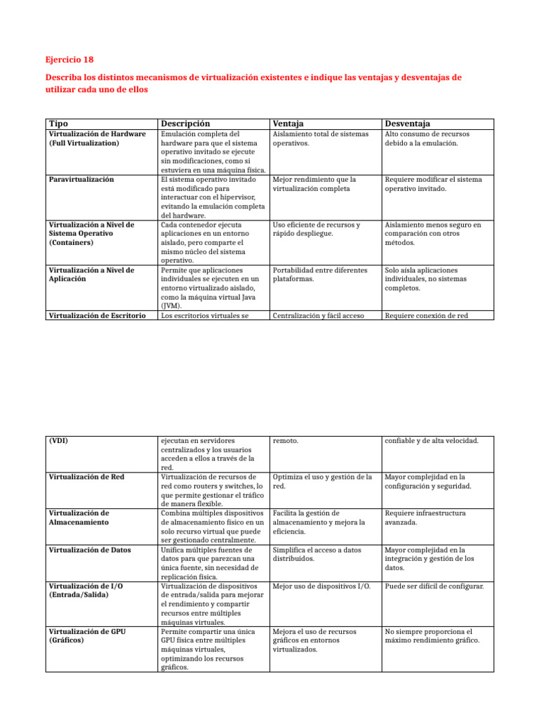 Describa los distintos mecanismos de virtualización existentes e indique las ventajas y desventajas de